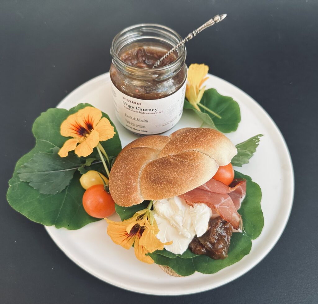 Talán a gyerekeknek, fiatalabb korosztálynak is ízleni fog. Harmonikus ízvilág, a krémsajt és a füge chutney igazán nyerő párosítás, és érdemes belecsempészni zöld leveleket. A rukkola illik hozzá, vagy ami a képen van, a sarkantyúka levele és virága. A sarkantyúka évek óta a kedvencem, nem hiányozhat egyetlen kertből sem! November elején is hihetetlen életképes, finom, kissé a retekhez hasonlító íze van, és persze gyógyító növény. Ha sok lenne a „töltelék”, ami krémsajt+sonka+chutney, ki lehet szedni a zsömle beléből keveset, és azt zsemlemorzsának kiszárítani. Így csomagolható lesz, és semmi, de semmi nem veszik kárba!