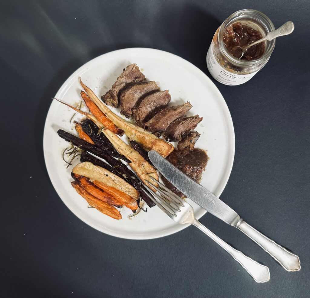 5) Lassan sült, legeltetett bárány, forrólevegős edényben sült gyökérzöldségekkel, füge chutney-val.